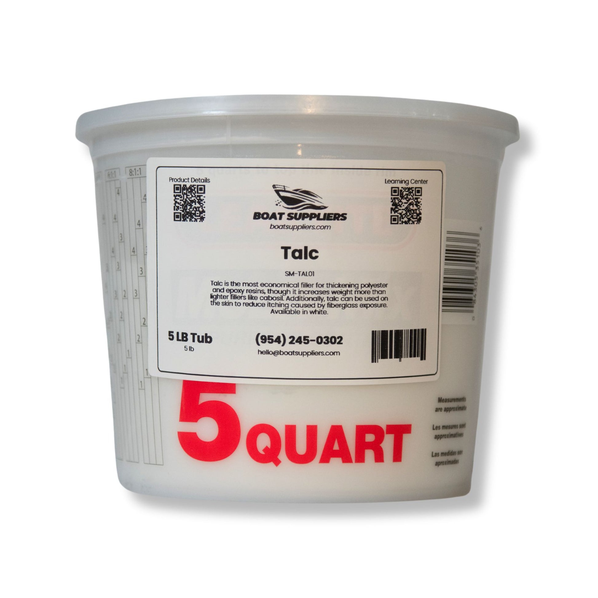 Talc is the most economical filler for thickening polyester and epoxy resins, though it increases weight more than lighter fillers like cabosil. Additionally, talc can be used on the skin to reduce itching caused by fiberglass exposure. Available in white.