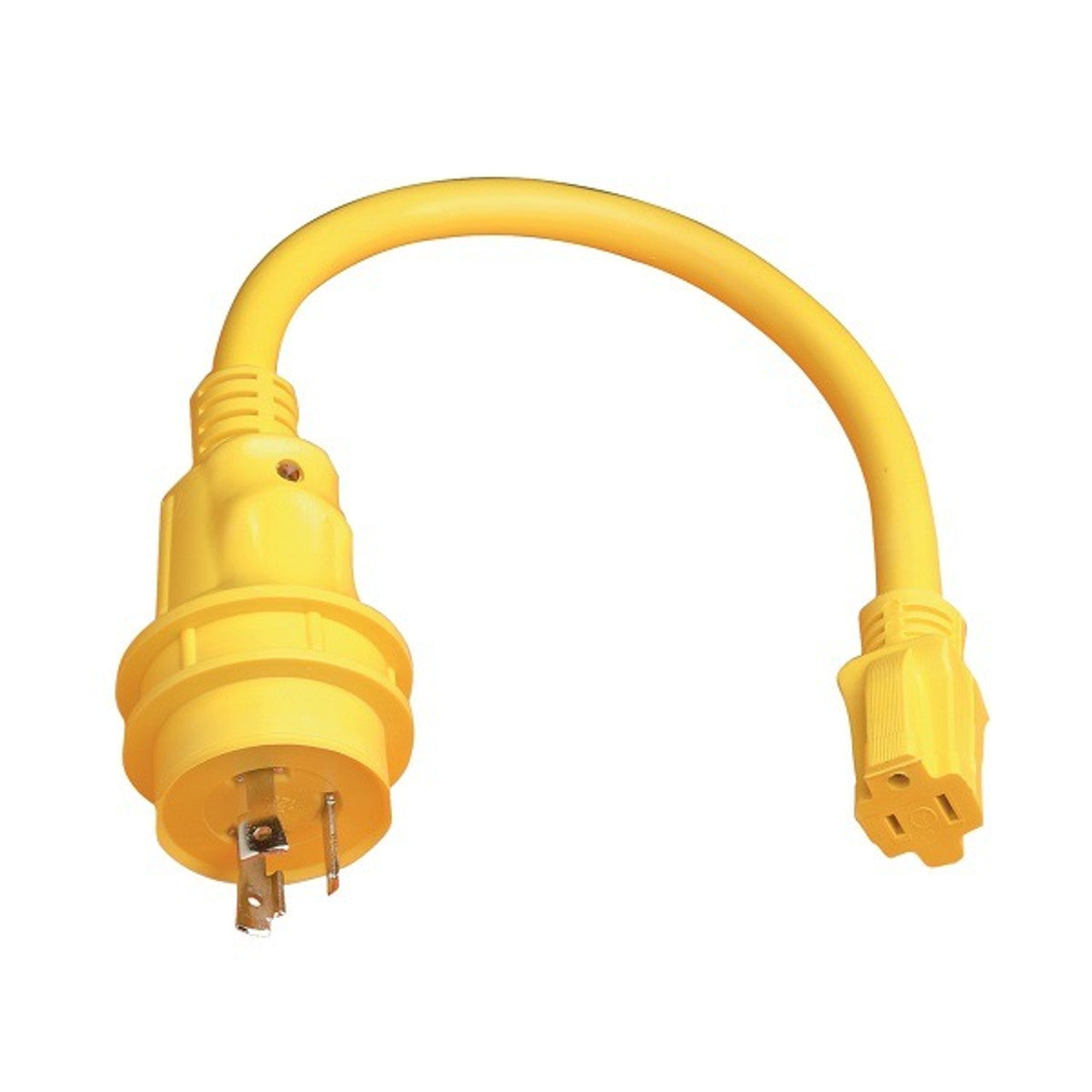 Adaptateur de quai Marinco 15 A avec connecteur en queue de cochon Plus. L'adaptateur de quai Marinco 15 A avec connecteur en queue de cochon Plus vous permet de connecter une prise de quai à une prise de bateau ou à un équipement ayant une configuration d'alimentation différente. Entièrement moulés, ces adaptateurs sont équipés du collier d'étanchéité et des couvercles Marinco pour une utilisation en milieu humide. Ils sont équipés de couvercles et de colliers d'étanchéité aux endroits indiqués, et sont conçus pour une utilisation en milieu humide. Ils sont dotés d'un indicateur de mise sous tension et d'un localisateur de prise.