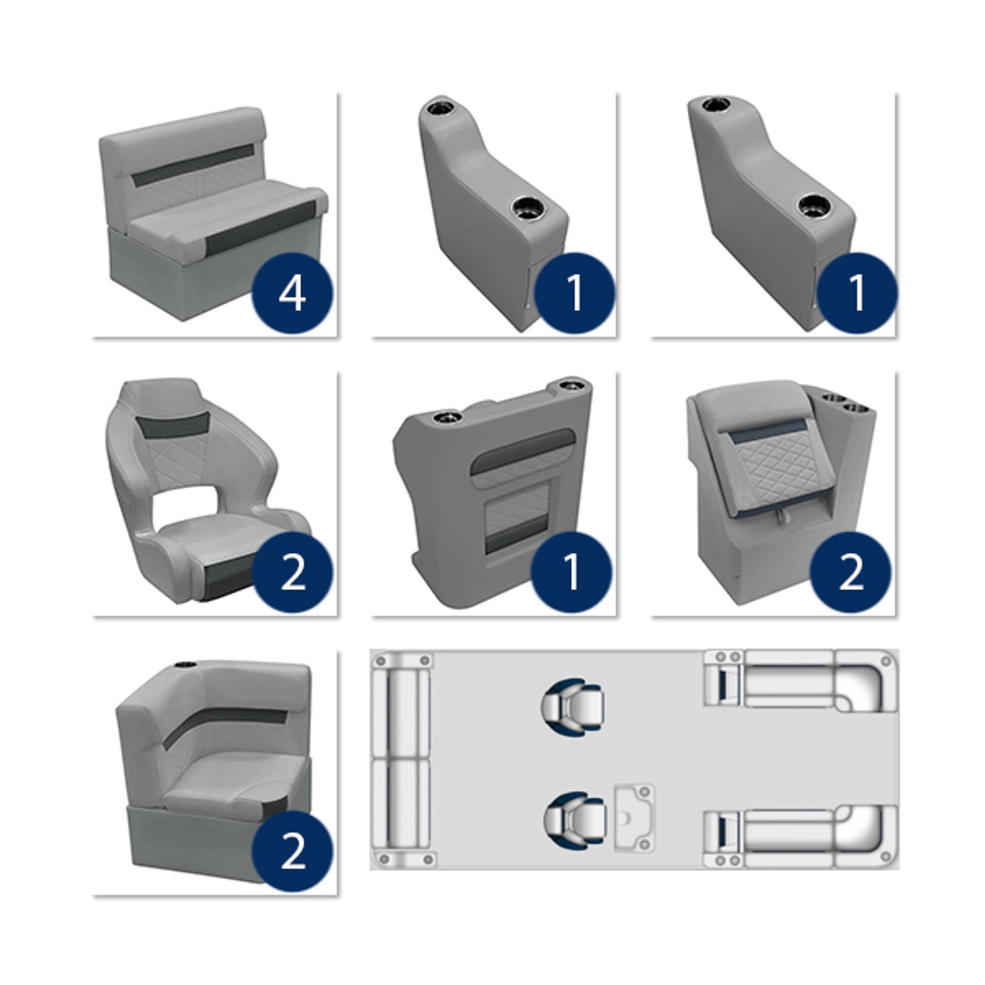 Ensemble de mobilier de ponton traditionnel Wise DLX 22 à deux sièges. Prêt à moderniser votre mobilier de ponton ? Cet ensemble de sièges pour ponton Wise DLX a tout ce qu'il vous faut. Ces sièges allient confort, durabilité et style, ce qui en fait le mélange parfait pour s'amuser en famille et se divertir sur l'eau. Cet ensemble complet est parfait pour équiper votre ponton de tout ce dont vous avez besoin. Les banquettes arrière et avant avec dossiers inclinables offrent des espaces parfaits pour recevoir. Les deux sièges baquets sont exc.