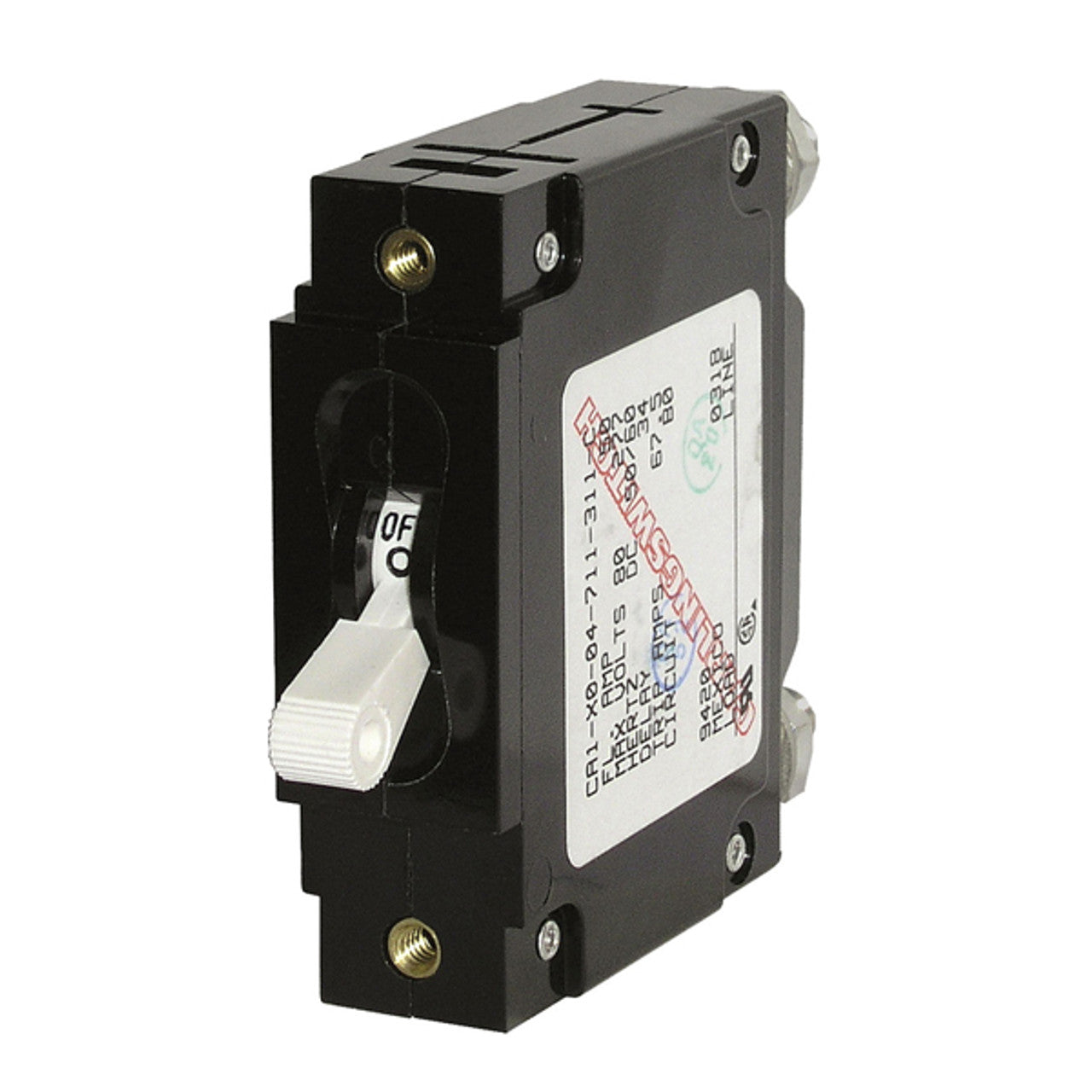 Blue Sea Systems C Series White Toggle Circuit Breaker - Single Pole The Blue Sea C Series Circuit Breaker provides overcurrent protection for inverters, bow thrusters, and windlasses. Features Combines switching and circuit protection into a single device. Trip Free - cannot be held closed after trip Circuit Breaker Type Magnetic Hydraulic - trip free Available in 10, 15, 20, 25, 30,50, 60, 80, 100 Amps Specifications Maximum Voltage 240V AC 80V DC Terminal Stud 14-20 Tin-Plated Brass Terminal