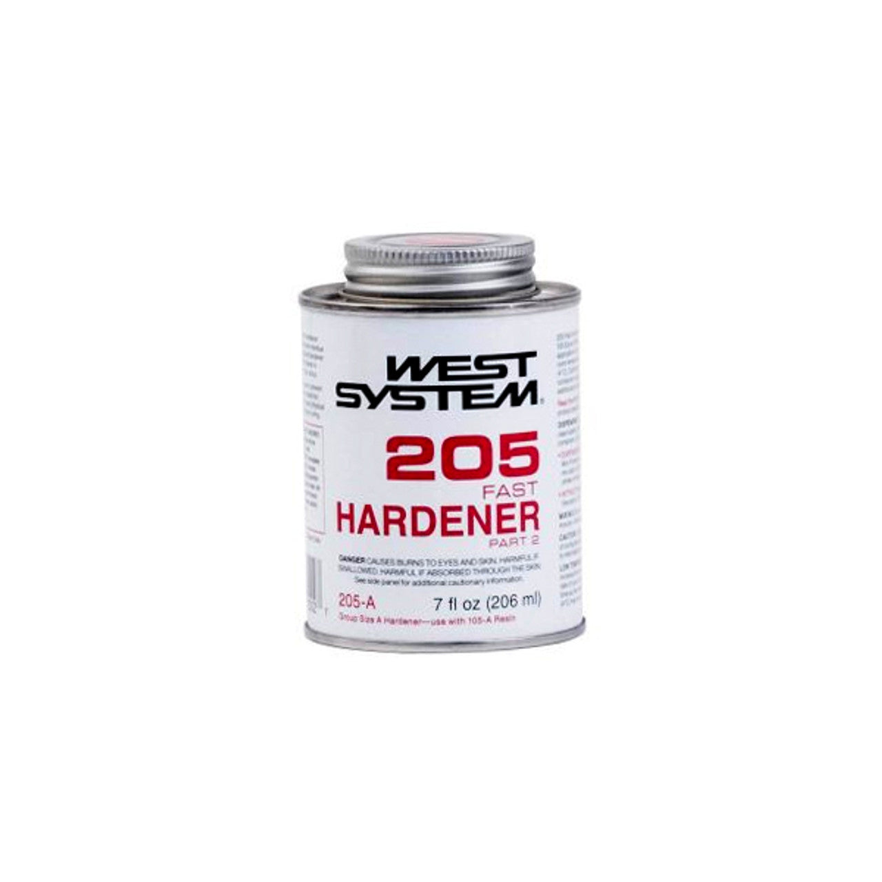 West System Fiberglass 205 Fast Hardener The 205 Fast Hardener is a medium viscosity epoxy curing agent for West System 105 Epoxy Resin. Able to rapid cure epoxy even in low temperatures. Mix with West System Resin in a five part resin to one part hardener ratio. The cured epoxy offers a high strength, rigid, and moisture resistant coat. Not intended for clear coating Product Features Pot Life at 72F 22C 9-12 minutes Cure to a solid state 6-8 hours Cure to Maximum Strength 1-4 days Minimum recom